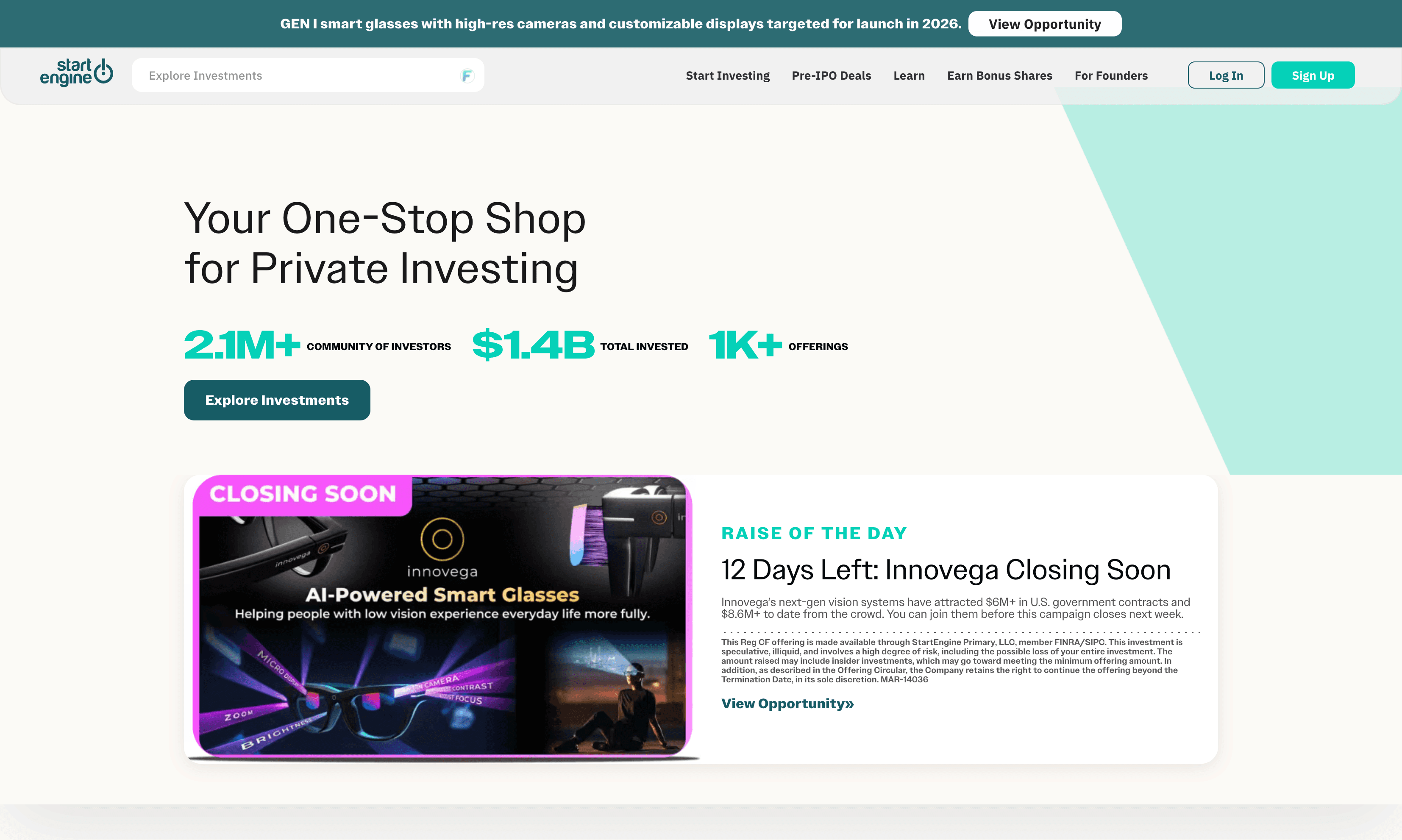 StartEngine and WeFunder are the preeminent platforms in the equity crowdfunding space. Rather than pitching one angel for a $50,000 check, these platforms allow you to pitch your entire customer base, allowing thousands of non-accredited retail investors (and active angels) to invest as little as $100 into your company.
