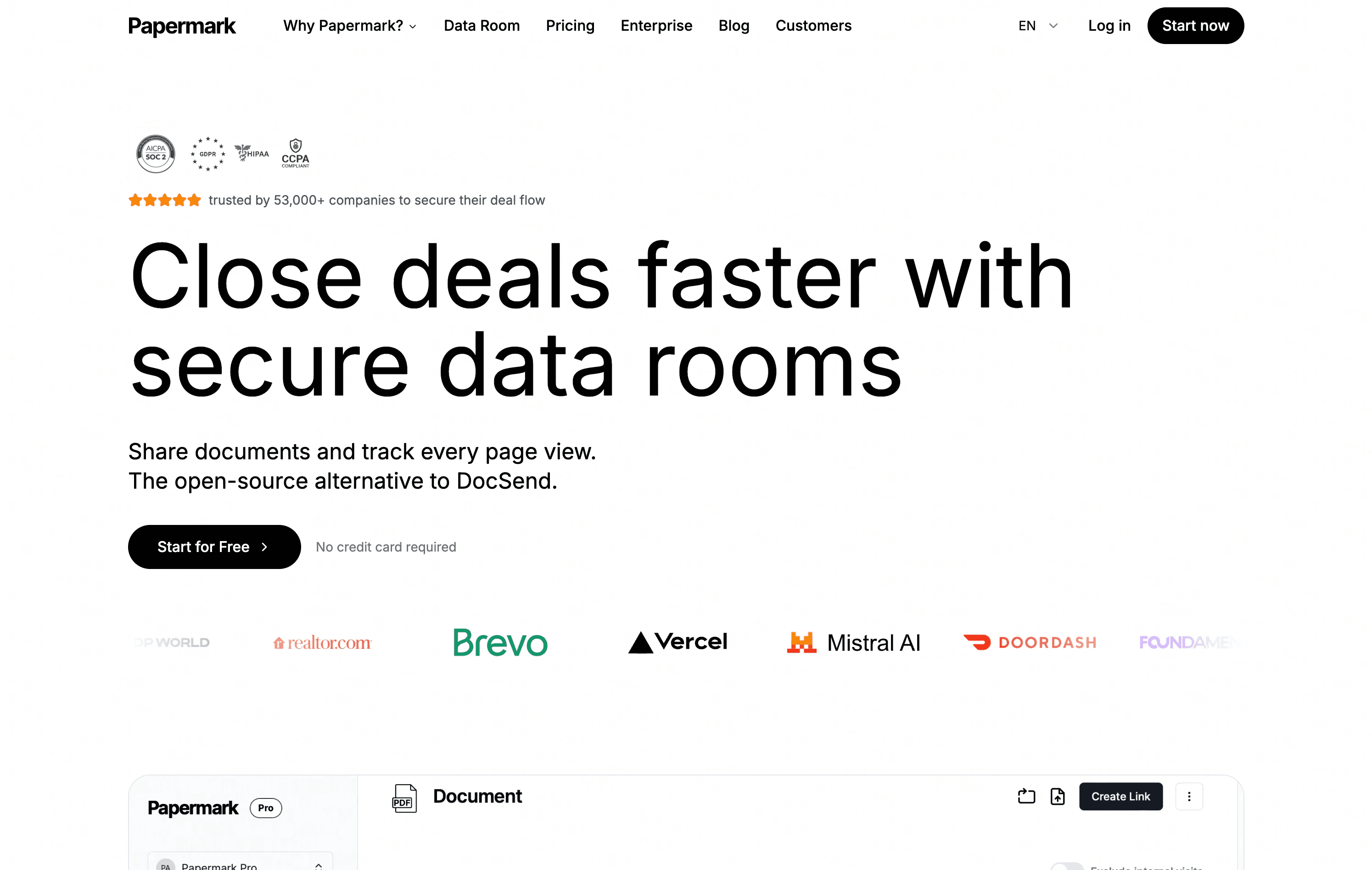 Papermark is an open-source alternative that has attracted significant adoption among cost-sensitive founders. The free tier works for basic document sharing, though you'll want the paid plan for active fundraising to remove Papermark branding and access page-by-page analytics. Technical founders can self-host for roughly $15 to $30 per month on infrastructure costs alone.