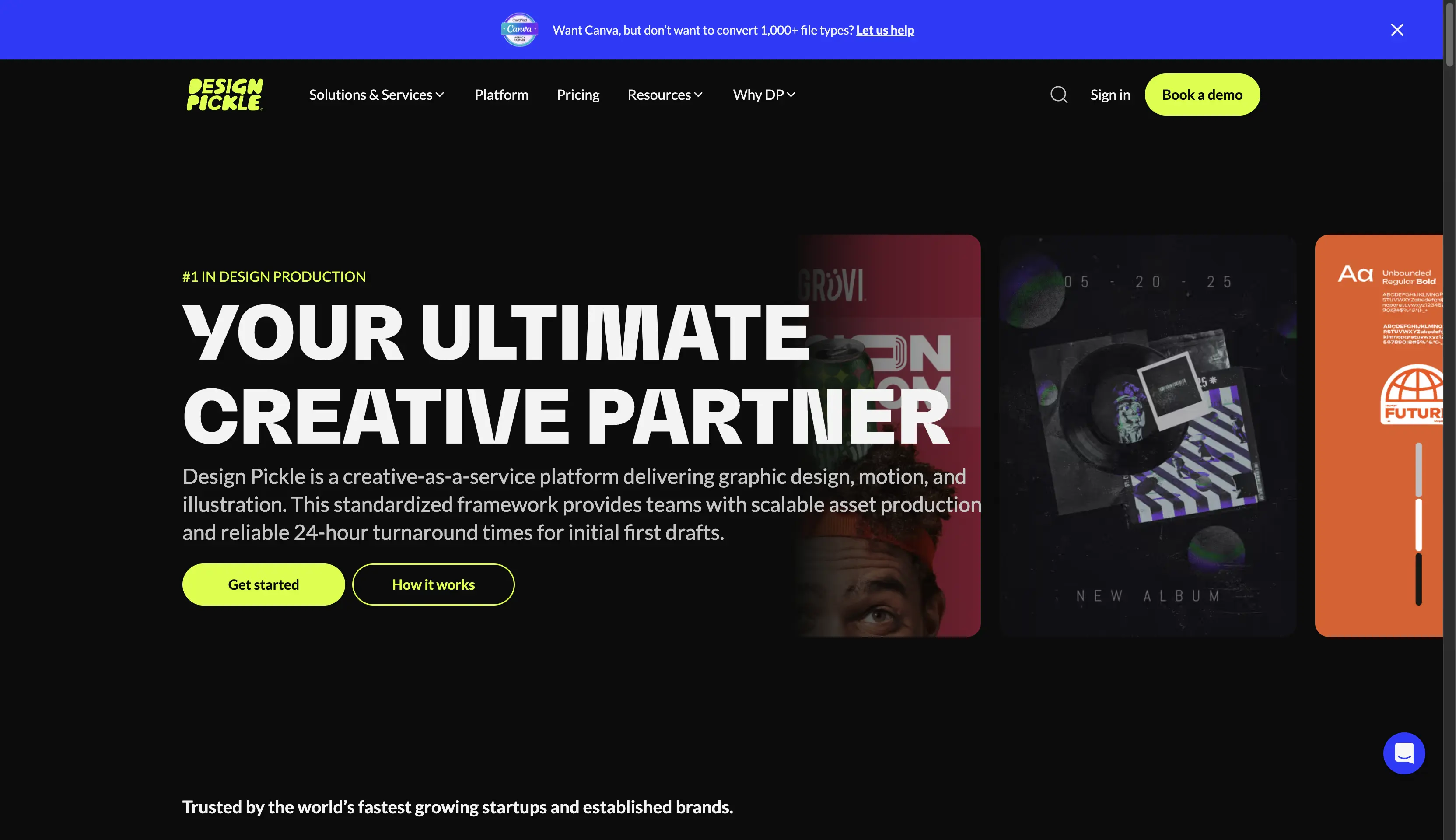 Design Pickle's biggest strength is reliability at volume. If you need consistent output at speed, social graphics, ad creative variants, presentations, and banners, their system is built for that kind of throughput. First drafts arrive within 24 hours, and customer-reported data shows teams triple their creative production after switching.