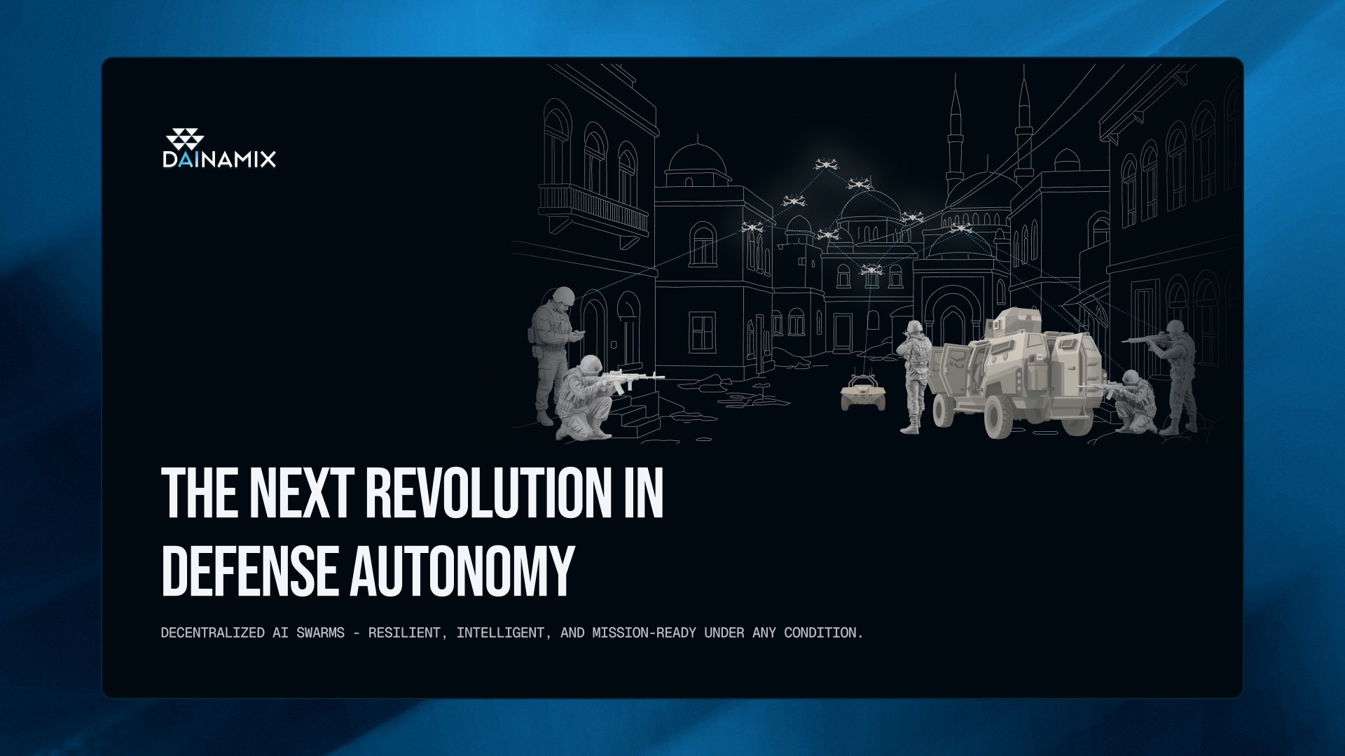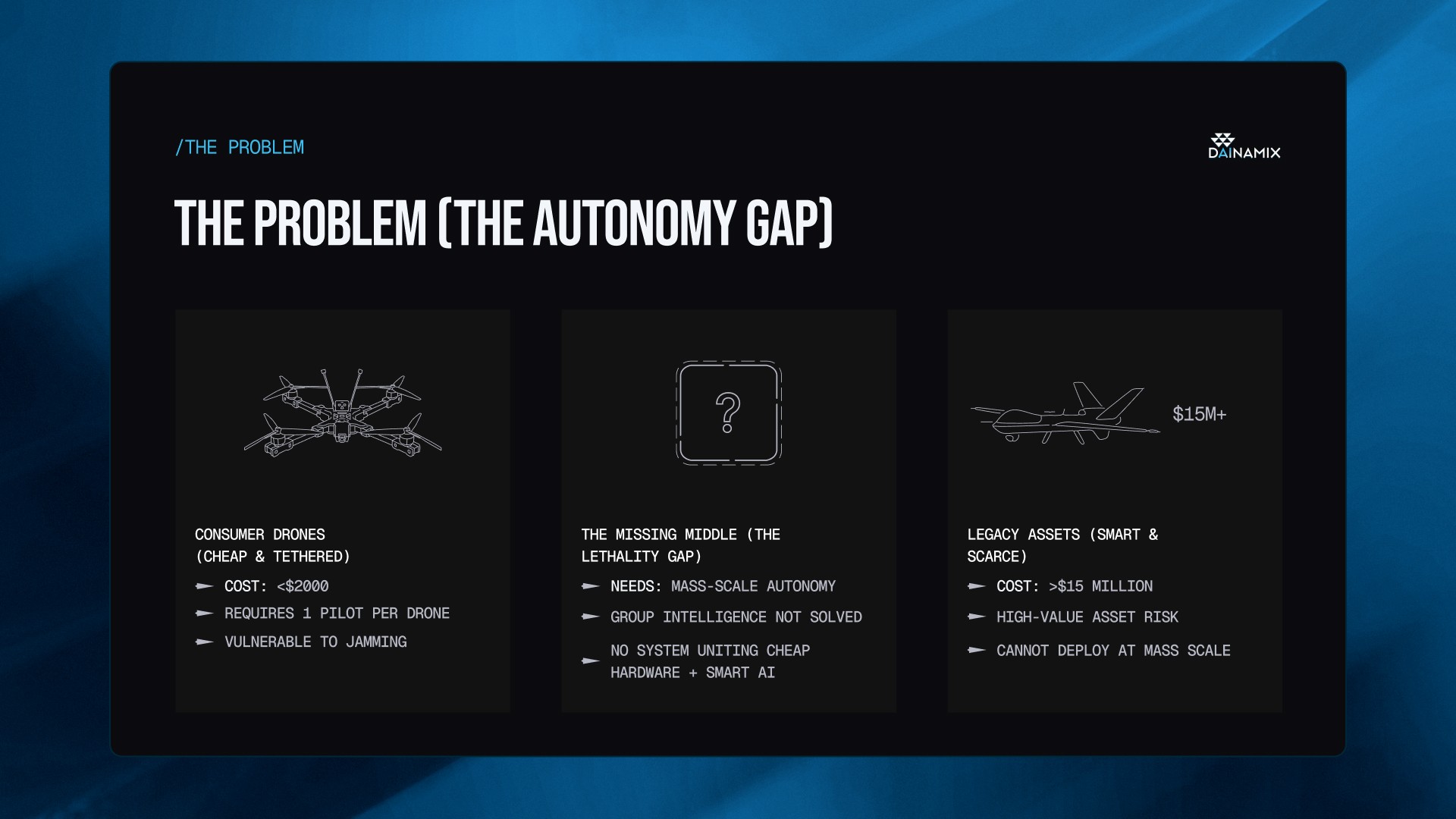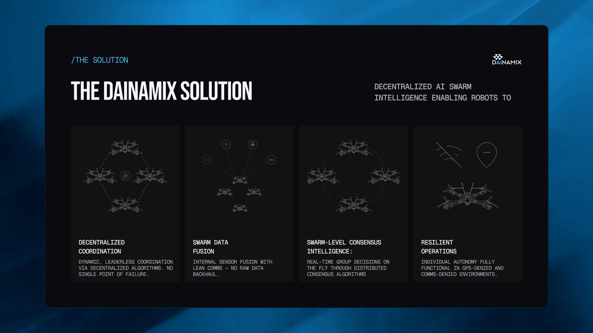 Created a sharp, investor-ready Pitch Deck for Dainamax that visualizes complex swarm intelligence and positions their software as a scalable autonomy solution.