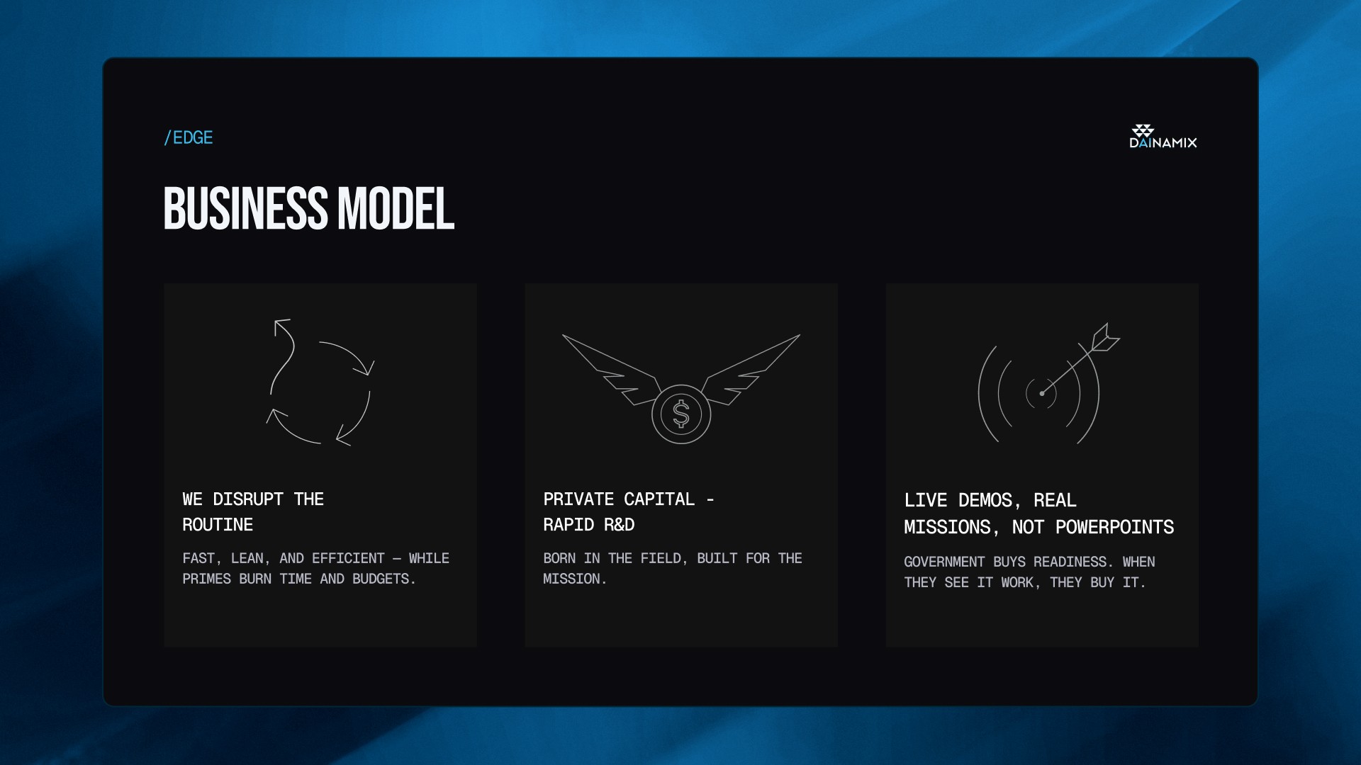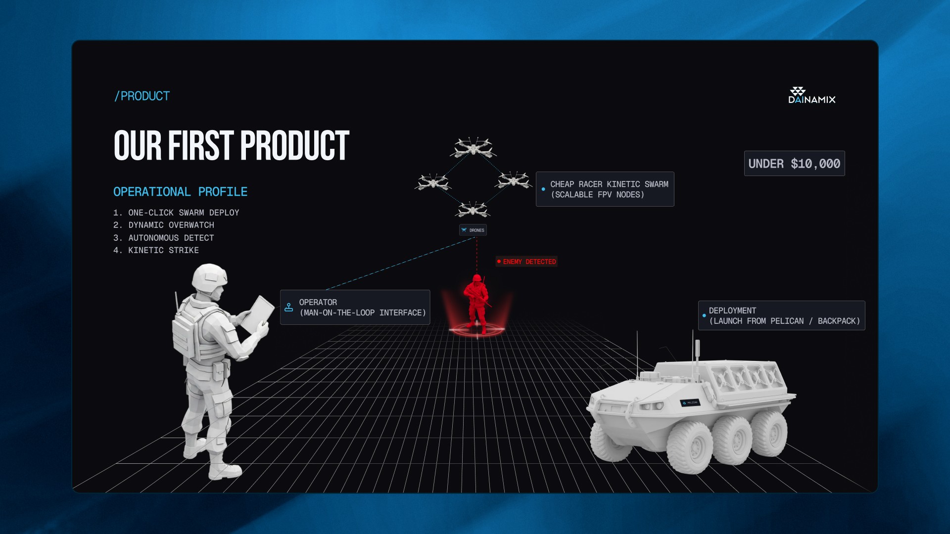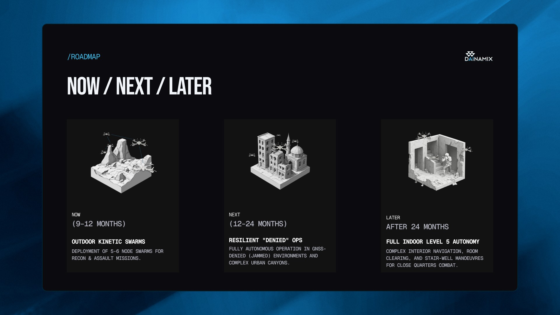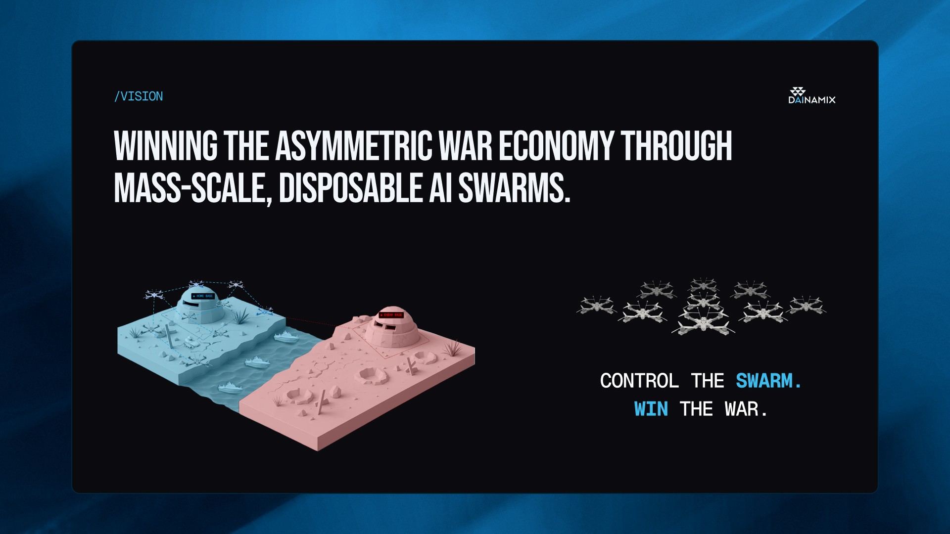 Created a sharp, investor-ready Pitch Deck for Dainamax that visualizes complex swarm intelligence and positions their software as a scalable autonomy solution.