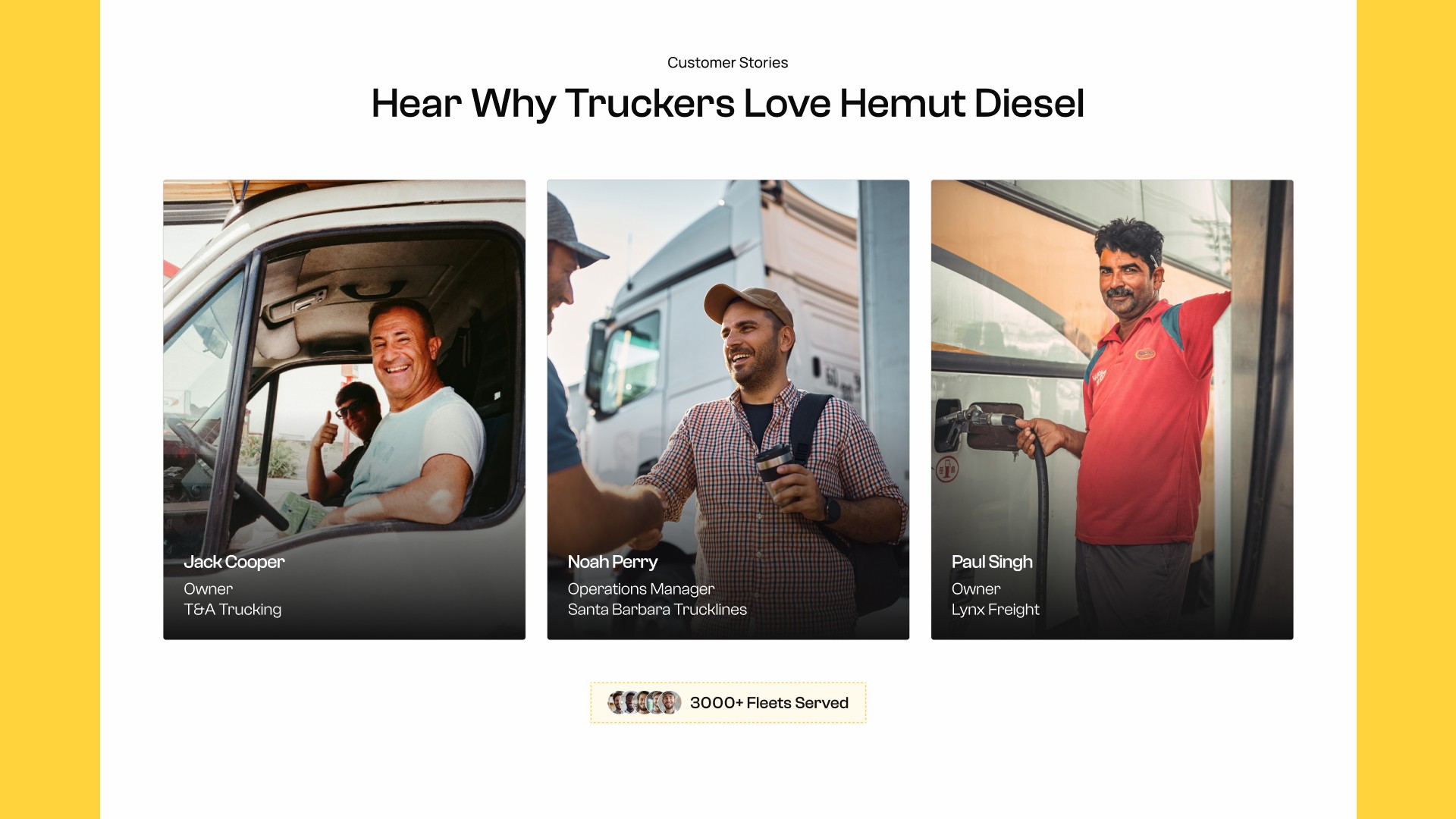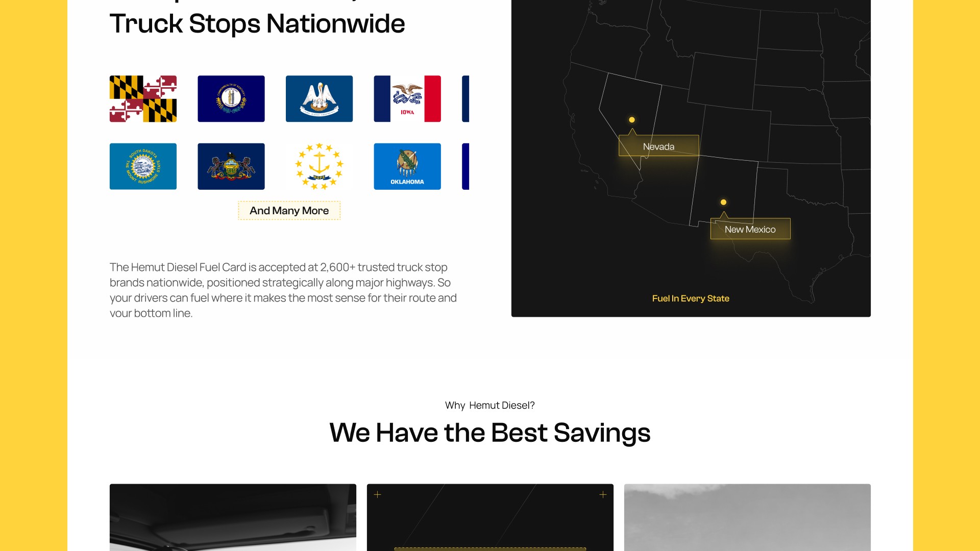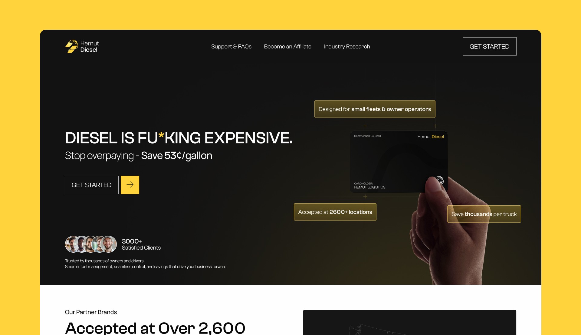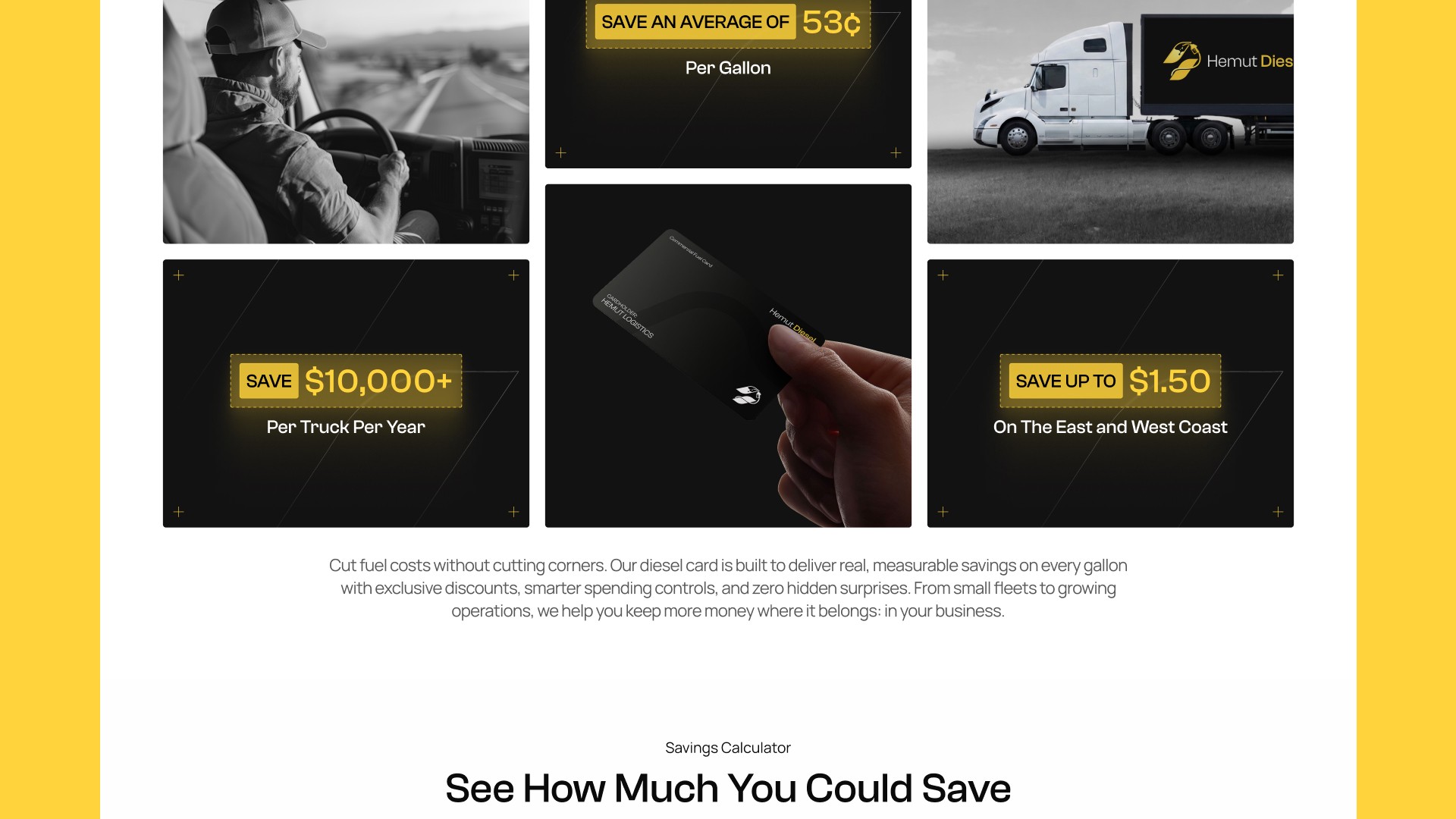 Hemut Diesel is a commercial fuel card built for small trucking fleets and owner-operators who are getting squeezed by rising diesel prices. Their card gives drivers access to discounted fuel at over 2,600 truck stops nationwide, with savings averaging 53 cents per gallon and as high as $1.50 on the East and West Coasts. The challenge for the landing page was making those numbers feel real and trustworthy to an audience that has seen plenty of fuel card offers and is skeptical of fine print.