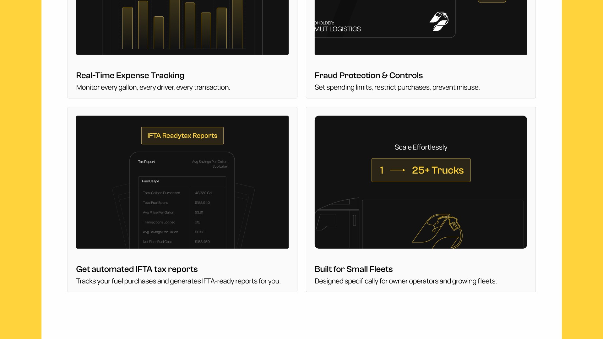 The page opens with a blunt, direct headline that speaks the way truckers actually talk, then anchors the claim immediately with specific numbers. Below the hero, a bento-style savings grid makes the value concrete across three different ways a trucker might think about cost: per gallon, per truck per year, and by region. A custom fuel savings calculator lets visitors plug in their own fleet size and weekly fuel usage to see a personalized savings estimate. The benefits section then covers what matters most to fleet operators: expense tracking, IFTA-ready tax reports, fraud controls, and nationwide acceptance.