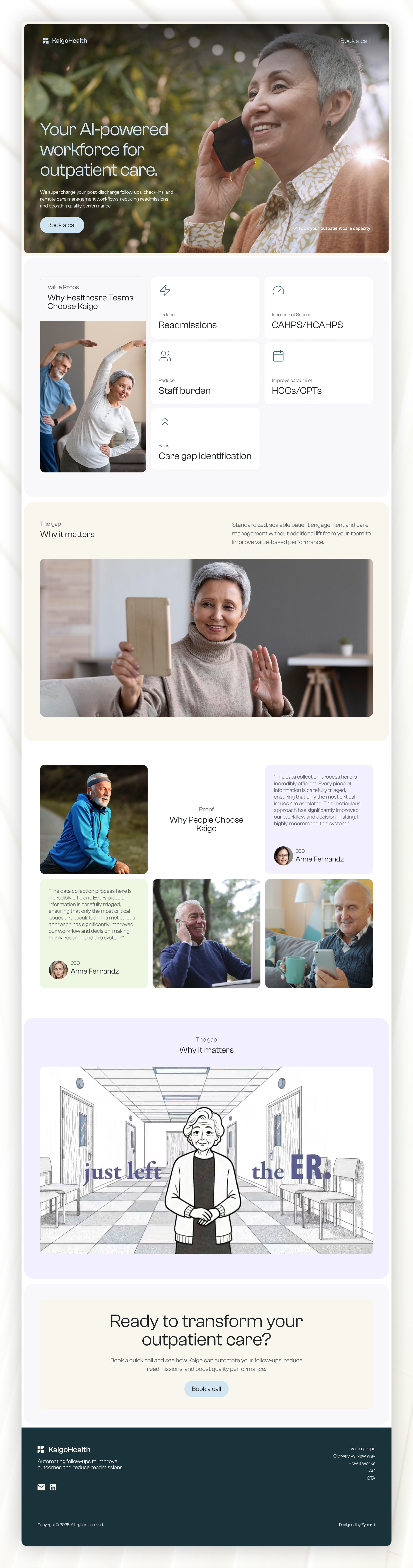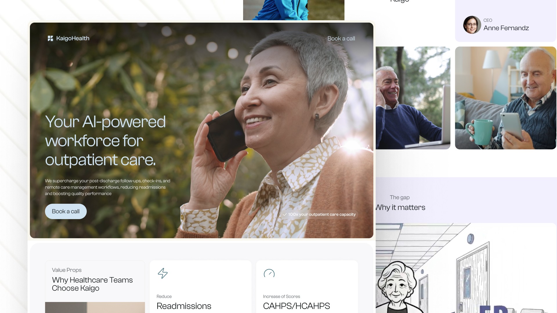 Designed a clear, trust-driven landing page for Kaigo Health, highlighting how AI-powered remote care improves outcomes for Medicare patients through simple, phone-based interactions.