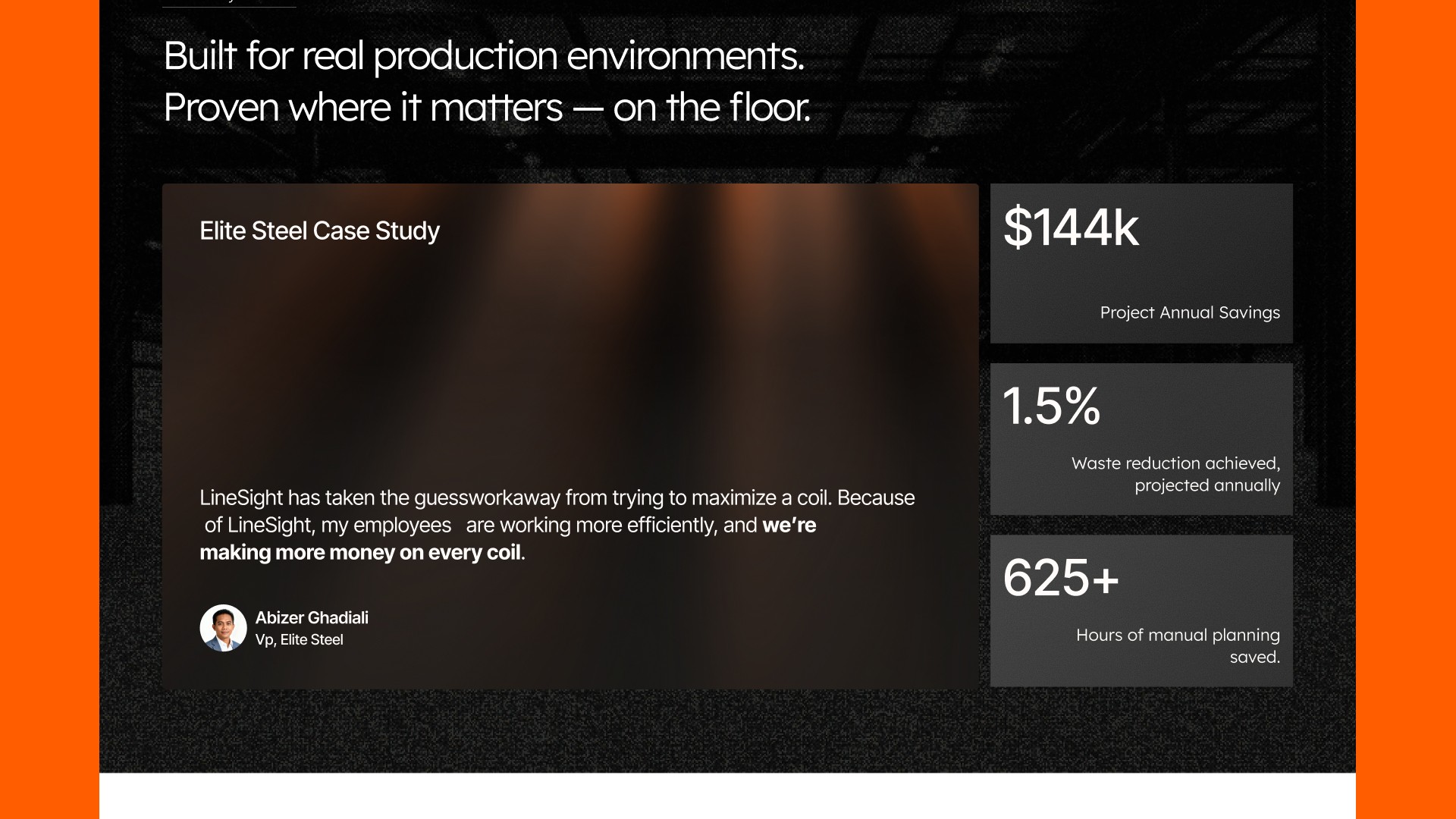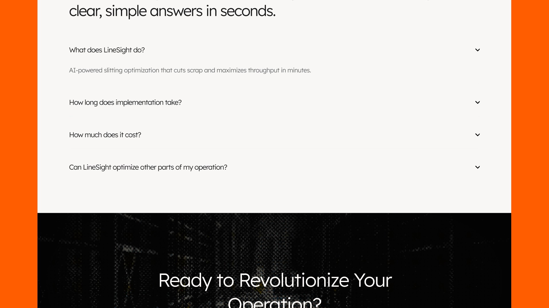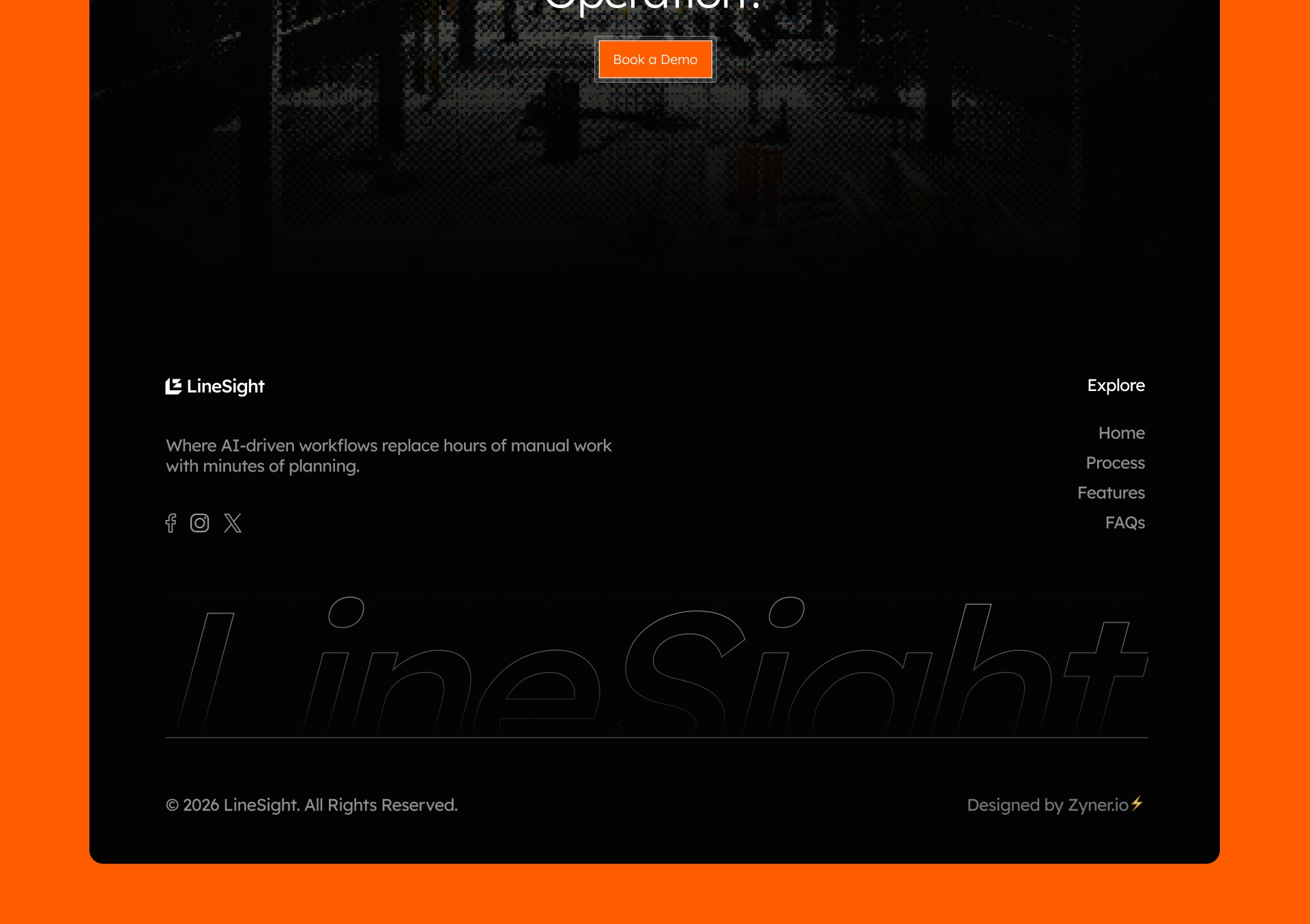 The result is a page that speaks the language of factory operators and production managers without being dense. The dark, orange-accented visual system carries an industrial weight that fits the environment LineSight is sold into, while the layout keeps the conversion path clear from first scroll to the CTA.