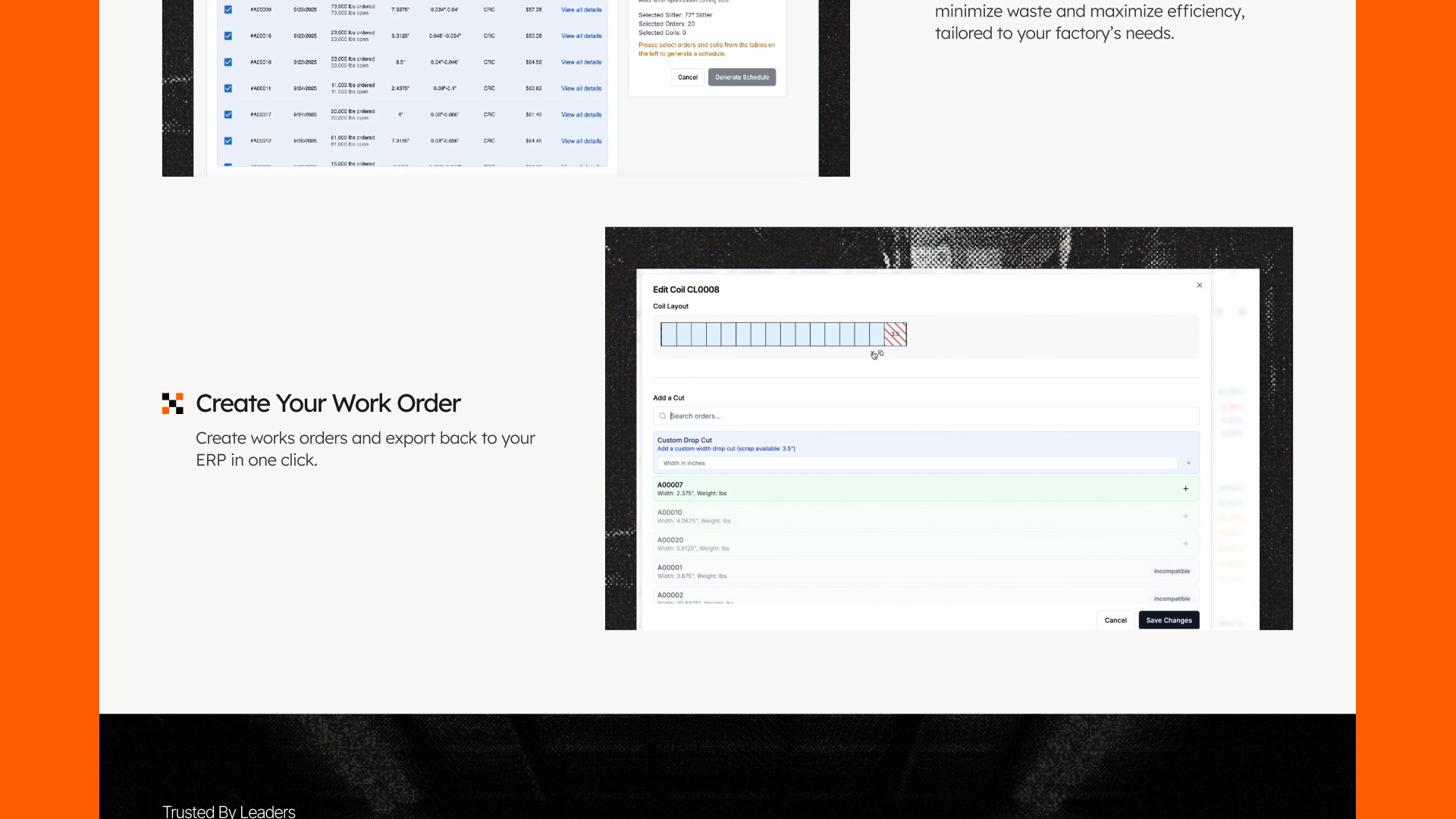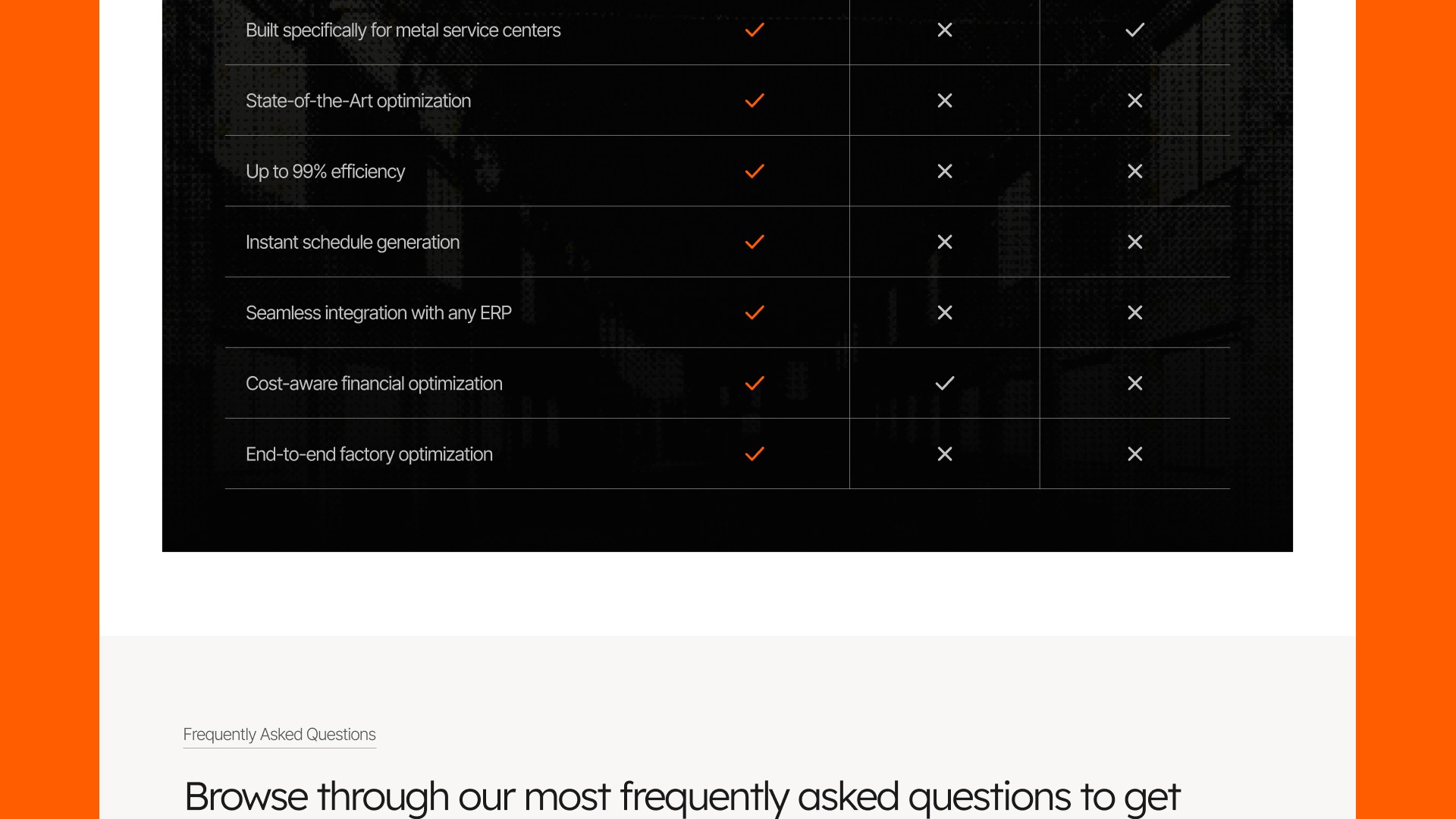 The landing page needed to work hard across a technically complex product with a non-technical entry point. The hero establishes the value proposition immediately with a product screenshot on a dark, industrial background. The problem section quantifies the cost of the status quo with a concrete calculator-style layout, before the solution and how-it-works sections walk visitors through the three-step workflow: connecting an ERP, generating a slitting plan, and exporting a work order. Features and a competitive comparison table sit below, followed by a case study section with real numbers from Elite Steel, a client that saw $144k in projected annual savings and 625+ hours of manual planning eliminated.