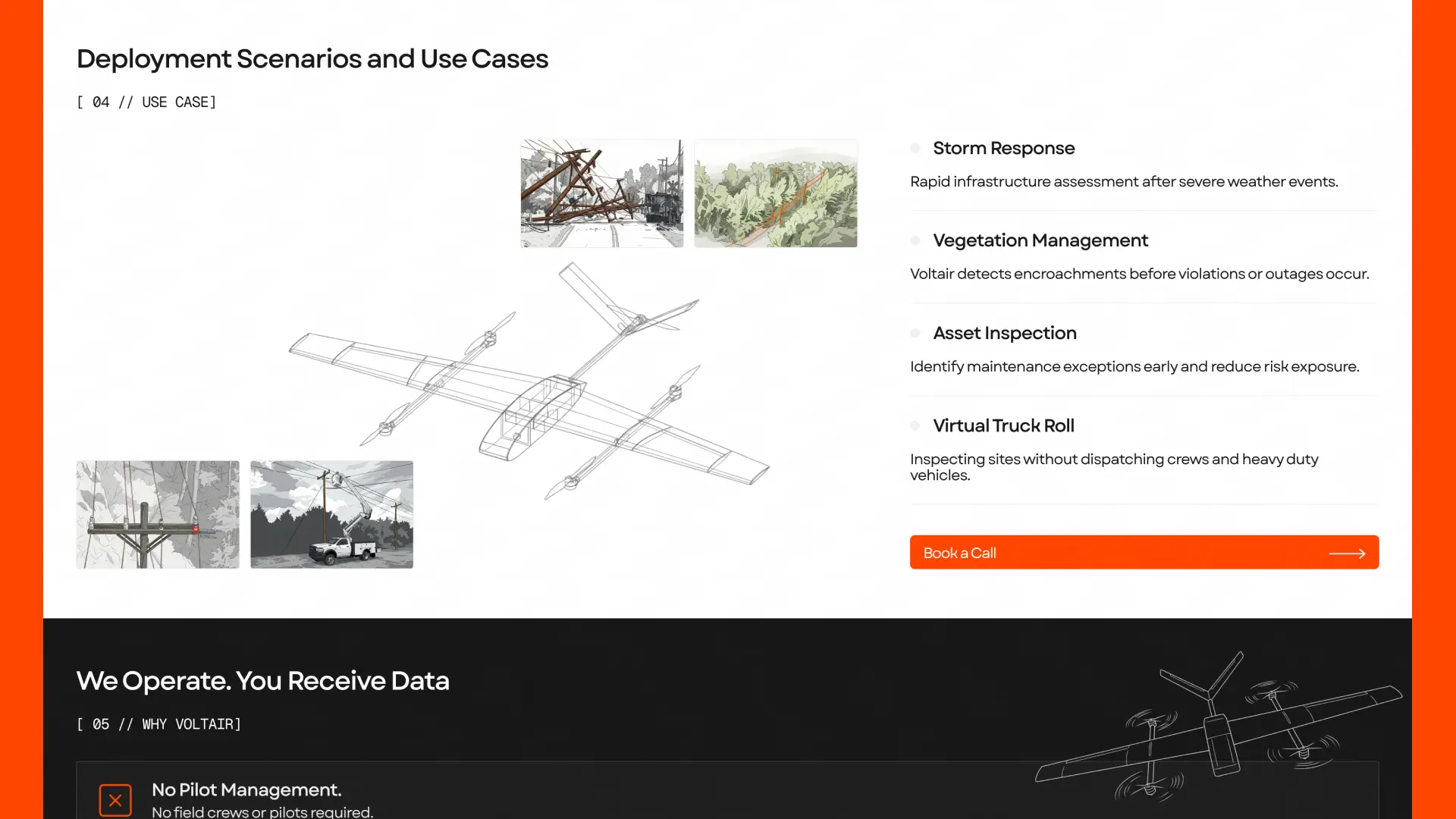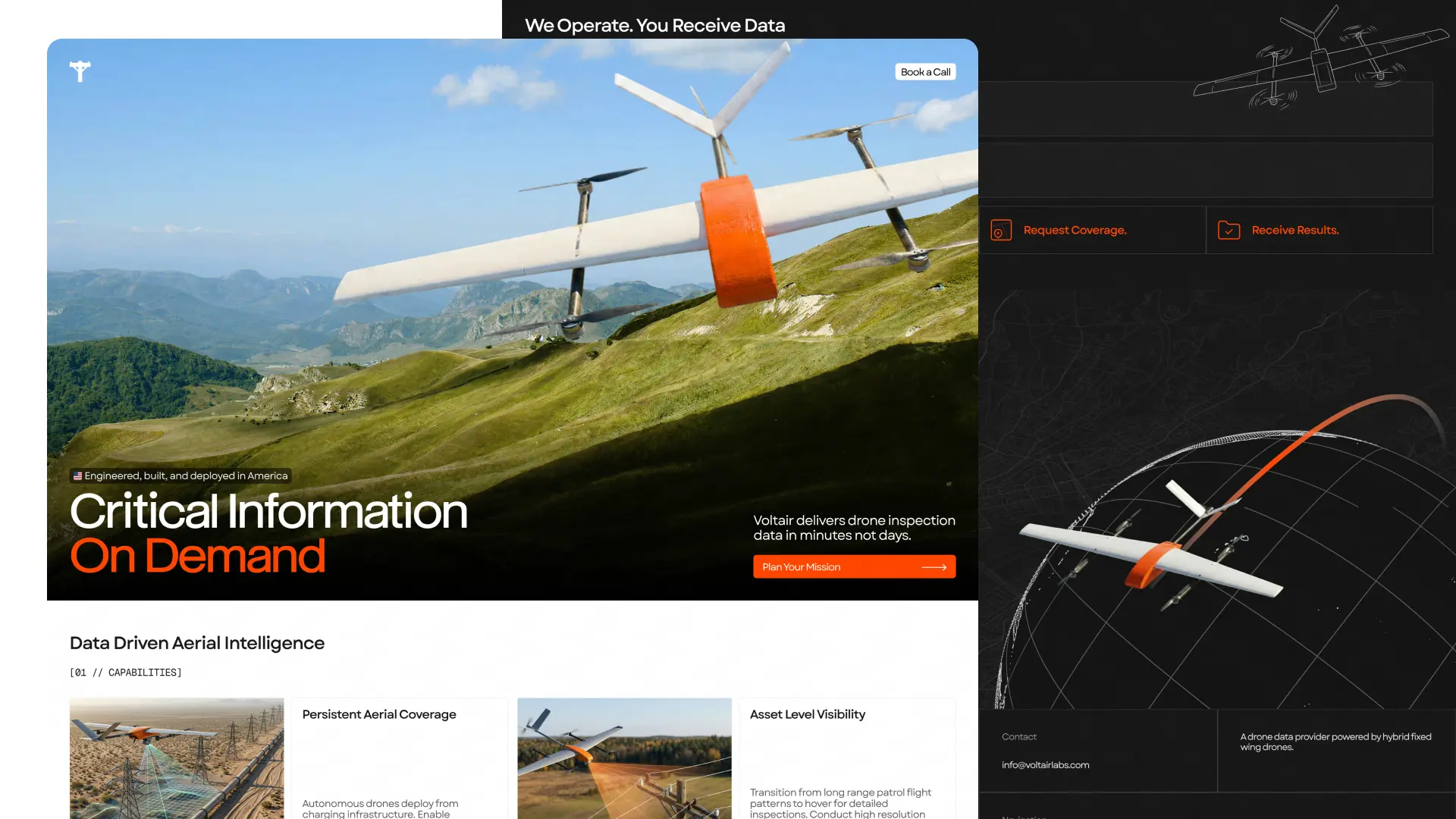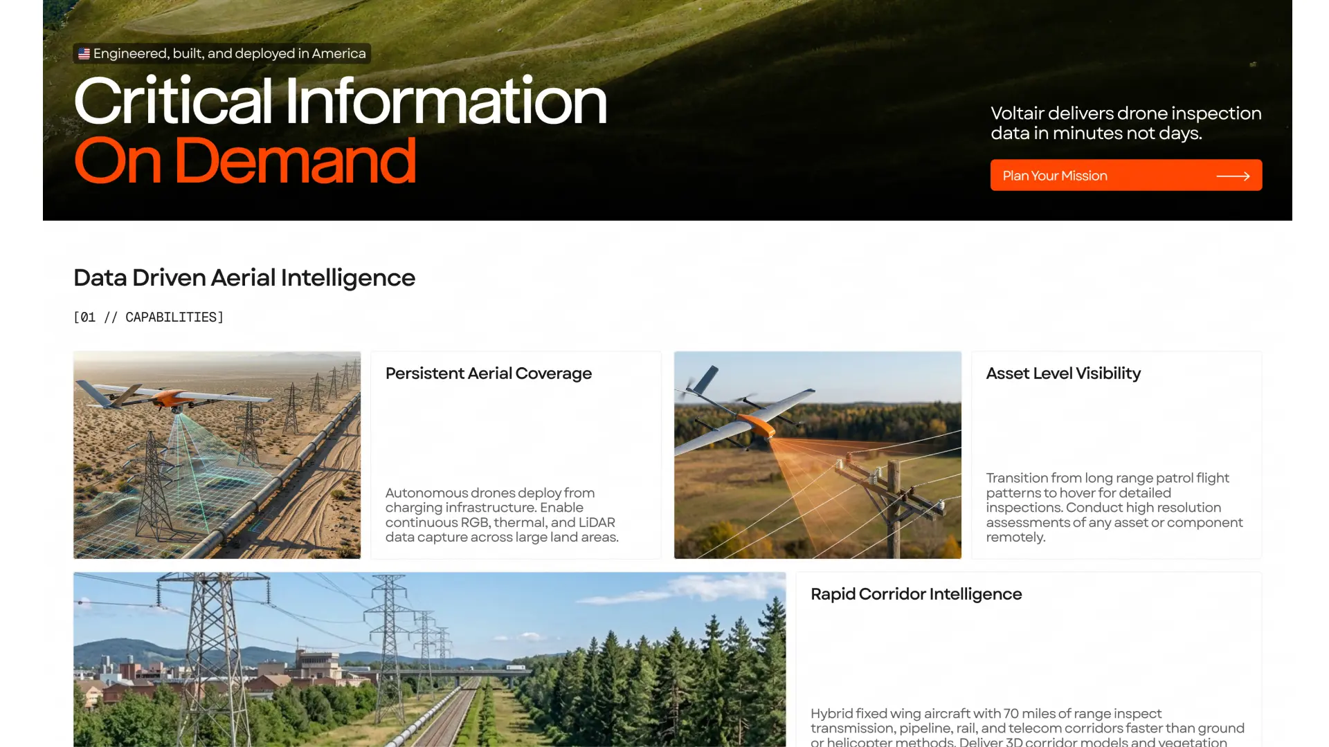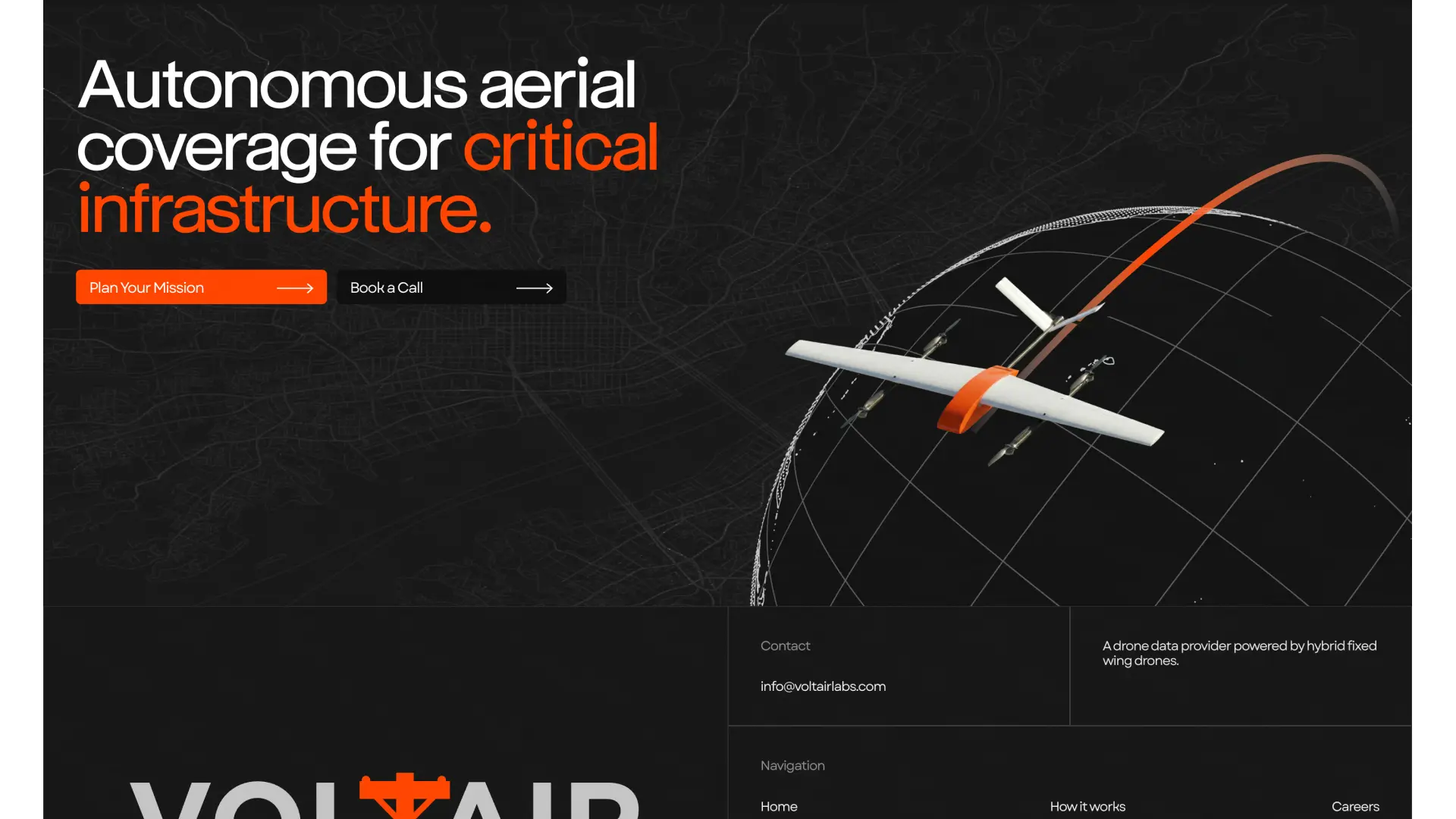 Voltair Labs is a drone data provider that deploys hybrid fixed-wing drones to inspect critical infrastructure: power transmission corridors, pipelines, rail lines, and telecom networks. Their model is fully managed: clients request coverage and receive data, with no pilots, no field crews, and no vehicle dispatches required. The design challenge was communicating a technically dense service offering to infrastructure operators who are used to slow, logistics-heavy inspection workflows. The landing page needed to build confidence quickly, not just explain capabilities.
